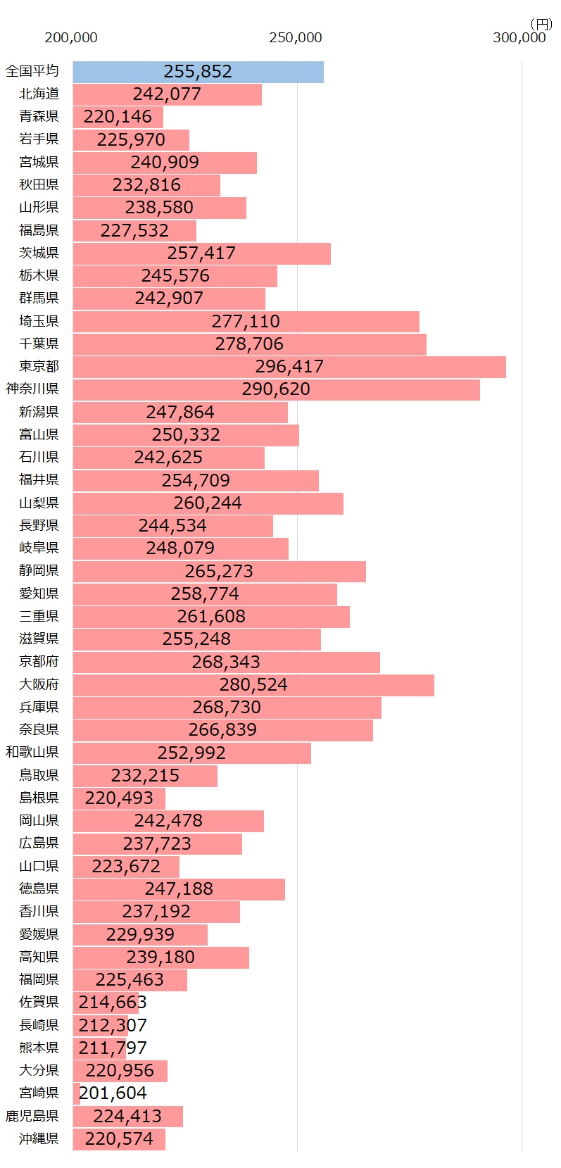 都道府県別の手当を含む平均給与では、関東圏(埼玉県・千葉県・東京都・神奈川県)と関西圏(京都府、大阪府、兵庫県、奈良県)の平均給与が高いことが分かります。